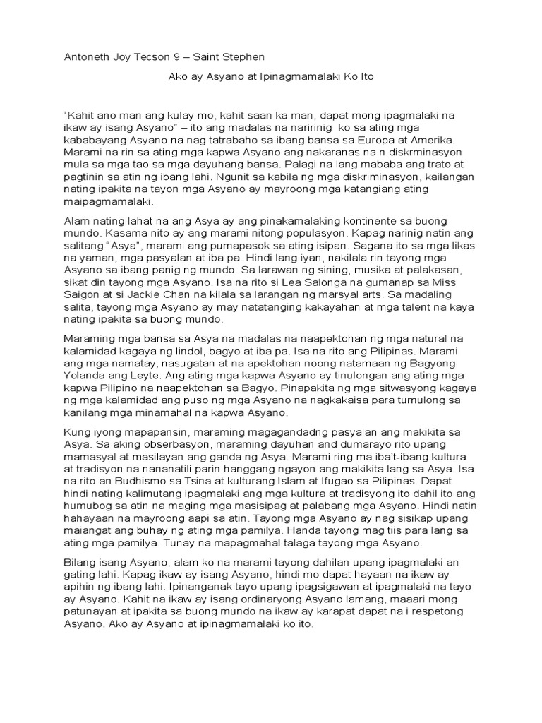 Asyano ako Ipagmamalaki ko Asyano Isang salita pero kailangan natin itong ipagmalaki Asyano Ngunit kailangan natin itong bigyang halaga Napagtanto ko sa aking isipan na mahalaga ang pagiging asyano Hindi man sa kulay natin Hindi man sa wika na ating ginagamit Kundi sa pagpapakita natin sa isang pagmamalaki na siyang kinagagalak bilang asyano Ang pagiging. Ang mga asyano Asyanong may angking galing. Angking galing na taas noo.