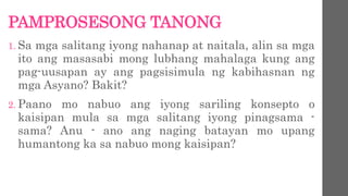 Mapahalagahan ang pagtugon ng mga Asyano sa mga hamon ng pagbabago pag-unlad at pagpapatuloy sa Timog at Kanlurang Asya sa transisyonal at makabagong panahon. Masusuri ang mga dahilan at paraan ng kolonyalismo at imperyalismo ng mga Kanluranin sa unang yugto ika-16 at ika-17 siglo pagdating nila sa Timog at Kanlurang Asya. Filipino 03112020 1055 joyce5512 Bilang isang mag-aaral paano mo pinahahalagahan ang mga kagamitang niluma na ng panahon.